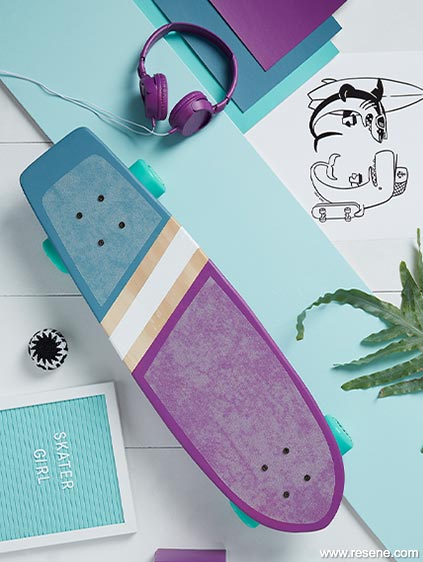 Background in Resene Triple Alabaster, floor board in Resene Scandal, A4 sized drawdown painted swatches in (from top to bottom) Resene Eye Candy, Resene Bismark and Resene Freelance, skateboard deck in Resene Eye Candy, Resene Bismark and Resene Alabaster and box and headphones in Resene Eye Candy. Accessories: Parker Chair in mint green from Cintesi; Skate Mates by Natasha Vermeulen from endemicworld. All other props are stylist’s own.